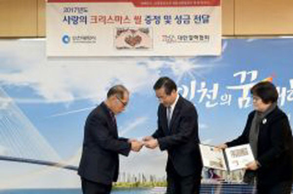 ÀÎõ½Ã´Â 11ÀÏ ½ÃûÀ» ¹æ¹®ÇÑ ´ëÇѰáÇÙÇùȸ ÀÎõ½ÃÁöºÎÀå(±è½Ç)°ú Å©¸®½º¸¶½º ¾Á ÁõÁ¤½ÄÀ» °®°í ¼º±ÝÀ» Àü´ÞÇß´Ù.