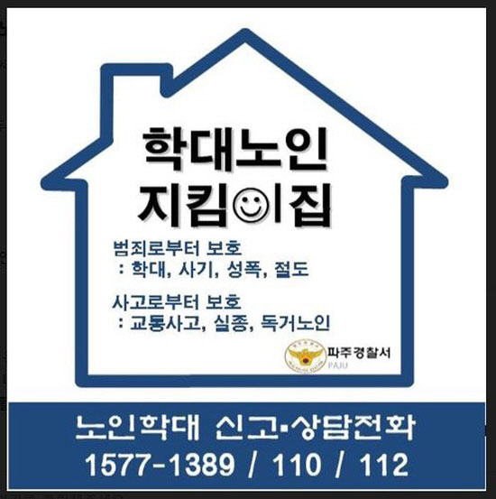 À̸¦ À§ÇØ ÆÄÁÖ¼´Â ÆÄÁֽÿ¡ ÀÖ´Â 408°³ÀÇ ³ëÀÎÁ¤¿¡ ¡®Çдë³ëÀÎ ÁöÅ´ÀÌÁý¡¯ ¾È³»½ºÆ¼Ä¿¸¦ ºÎÂø, ÇÐ´ë µî ¹üÁ˹߻ýÇÏ¸é ³ëÀÎÁ¤¿¡¼ °æÂû±â°ü¿¡ Áï½Ã ½Å°í, Ãâµ¿ÇØ ÇØ°áÇÏ´Â ¿ªÇÒÀ» Çϱâ À§ÇØ ÀÓ¹«¸¦ ºÎ¿©ÇØ »çȸ¾ÈÀü¸Á One-Stop ½Ã½ºÅÛÀ¸·Î ¿î¿µÇÑ´Ù.