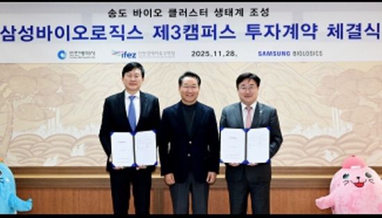 ÀÎõ½Ãû Á¢°ß½Ç¿¡¼ '»ï¼º¹ÙÀÌ¿À·ÎÁ÷½º Á¦3Ä·ÆÛ½º ÅõÀÚ°è¾à ü°á½Ä'À» °®°í ±â³äÃÔ¿µÀ» Çϰí ÀÖ´Ù. (¿ÞÂʺÎÅÍ Á¸¸² ´ëÇ¥ÀÌ»ç, À¯Á¤º¹ ½ÃÀå, À±¿ø¼® ÀÎõ°æÁ¦Ã»Àå)