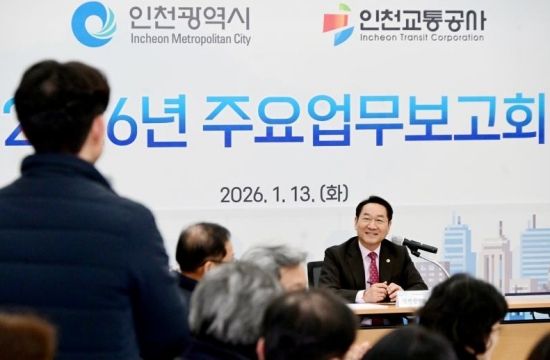 À¯Á¤º¹ ÀÎõ½ÃÀåÀÌ ³²µ¿±¸ ÀÎõ±³Åë°ø»ç '2026 ÁÖ¿ä¾÷¹«º¸°íȸ'¿¡¼ ¾÷¹«º¸°í¸¦ ¹Þ°í ÀÖ´Ù.(»çÁø= ÀÎõ½Ã Á¦°ø)