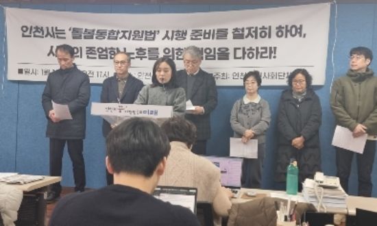ÀÎõ½Ã¹Î»çȸ´Üü¿¬´ë¿¡¼ ±âÀÚȸ°ßÀ» °®°í ÀÖ´Ù.(»çÁø= ±è»ó¼· ±âÀÚ)
