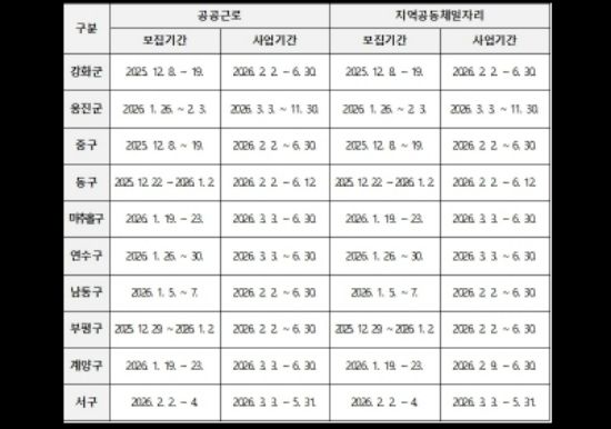 ÀÎõ½Ã´Â ¿ÃÇØ °ø°øÀÏÀÚ¸®»ç¾÷ ¿¬°£Ã¤¿ë¸ñÇ¥ ÀοøÀ» ÃÑ 695¸íÀ¸·Î ¼³Á¤Çϰí, ÀÌÁß °ø°ø±Ù·Î»ç¾÷ 420¸í, Áö¿ª°øµ¿Ã¼ÀÏÀÚ¸®»ç¾÷ 275¸íÀ» 10°³ ±º¡¤±¸¿¡¼ »ç¾÷À» ÃßÁøÇÒ °èȹÀÌ´Ù.