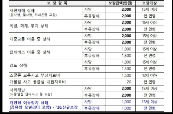 ¶Ç, Àüµ¿Å±º¸µå µî °³ÀÎÇü À̵¿ÀåÄ¡(PM)ÀÌ¿ëÁõ°¡¿¡ µû¸¥ »ç°í´ëºñ, »ç¸Á(1000¸¸¿ø)°ú ÈÄÀ¯ÀåÇØ(ÃÖ´ë 1000¸¸¿ø Çѵµ)º¸ÀåÇ׸ñÀ» Ãß°¡ÇØ ½Ã¹Î»ýȰ°ú ¹ÐÁ¢ÇÑ ¾ÈÀü»ç°í ´ëºñ¸¦ °ÈÇß´Ù.