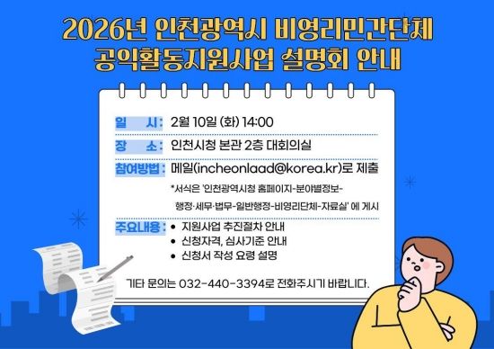 À̹ø ¼³¸íȸ´Â ÀÎõ½Ã¿¡ µî·ÏµÈ ºñ¿µ¸®¹Î°£´ÜüÁß ¡®2026³â ÀÎõ½Ã ºñ¿µ¸®¹Î°£´Üü °øÀÍȰµ¿ Áö¿ø»ç¾÷¡¯ Âü¿©Èñ¸Á ´Üü¸¦ ´ë»óÀ¸·Î ÀÎõ½Ãû º»°ü2Ãþ ´ëȸÀǽǿ¡¼ ÁøÇàÇÑ´Ù.