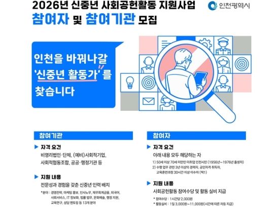 ÀÎõ½Ã´Â ÀÌ´Þ 11ÀϺÎÅÍ 27ÀϱîÁö ¡®½ÅÁ߳⠻çȸ°øÇåȰµ¿ Áö¿ø»ç¾÷¡¯¿¡ Âü°¡ÇÒ ±â°ü°ú Âü¿©ÀÚ¸¦ ¸ðÁýÇÑ´Ù°í ¹àÇû´Ù.