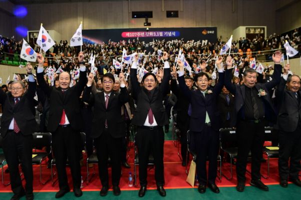 3¡¤1Àý ±â³ä½Ä Âü°¡ÀÚµéÀÌ ¸¸¼¼ »ïâÀ» ¿ÜÄ¡°í ÀÖ´Ù. [»çÁø=°È±º]