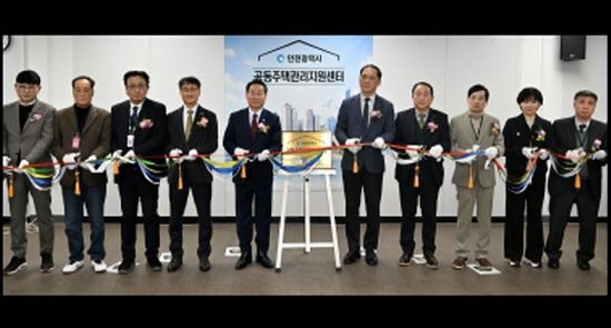 À¯Á¤º¹ ÀÎõ½ÃÀåÀÌ 'ÀÎõ½Ã °øµ¿ÁÖÅà °ü¸®Áö¿ø¼¾ÅÍ °³¼Ò½Ä'¿¡¼ Âü¼®ÀÚµé°ú Å×ÀÌÇÁÄ¿ÆÃÀ» Çϰí ÀÖ´Ù.(»çÁø= ÀÎõ½Ã Á¦°ø)
