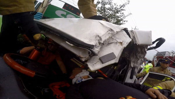 ´ë¿øµéÀº À¯¾Ð Àü°³±â µî ±¸Á¶Àåºñ¸¦ Ȱ¿ë, °è±âÆÇ°ú ¿ä±¸ÀÚÀÇ °ø°£À» È®º¸ ÈÄ ¾ÈÀüÇÏ°Ô ±¸Á¶Çß´Ù. ºÎ»óÀ» ÀÔÀº ¿îÀüÀÚ´Â ±¸±Þ´ë¿¡ ÀÇÇØ Àα٠º´¿øÀ¸·Î À̼۵ƴÙ.